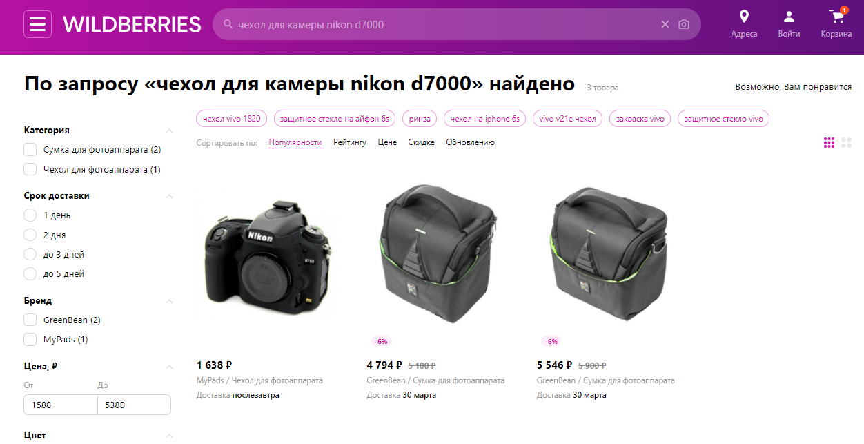 Что, если человек не знает, как называется нужный ему товар, но знает детали того, который у него уже есть? По совместимости ищут часто — вводят название или марку предмета, которым владеют, и тип аксессуара или запасной части, которая нужна. Например, «чехол для камеры Nikon D7000».