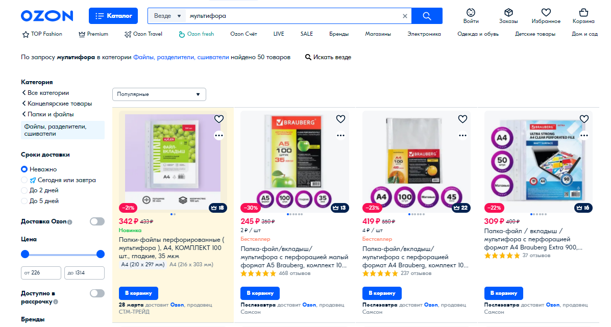 Подобные проблемы Baymard University нашел у 61% всех сайтов. Если система не поддерживает синонимы, пользователи или не видят нужные им товары на сайте вообще, или видят только часть предложений. Решить проблему могут сами продавцы, добавив в название товара несколько вариантов. Вот как из этой проблемы выходят поставщики канцелярии на Ozon — у товара три слова в названии. Так, люди привыкшие называть файл мультифорой, смогут найти товар.