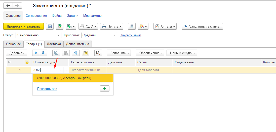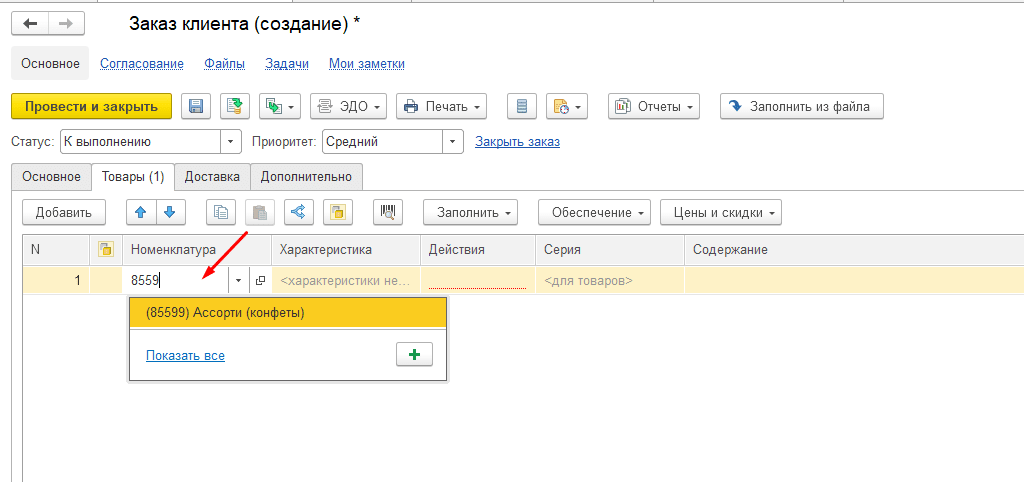- Открыть форму поиска товара в программе 1С:Предприятие.