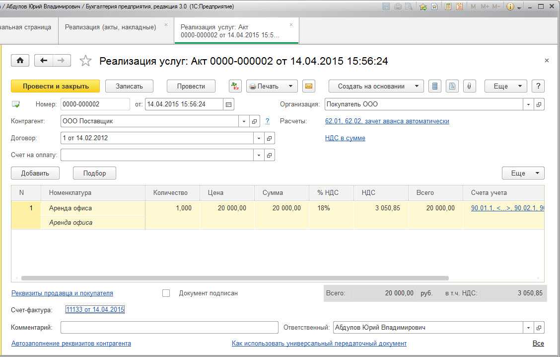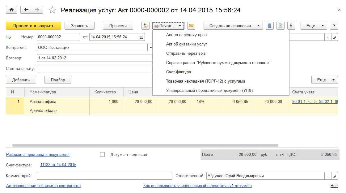В карточке вводятся все данные документа. При бумажном документообороте документ распечатывается (из карточки или из реестра) и отправляется контрагенту.