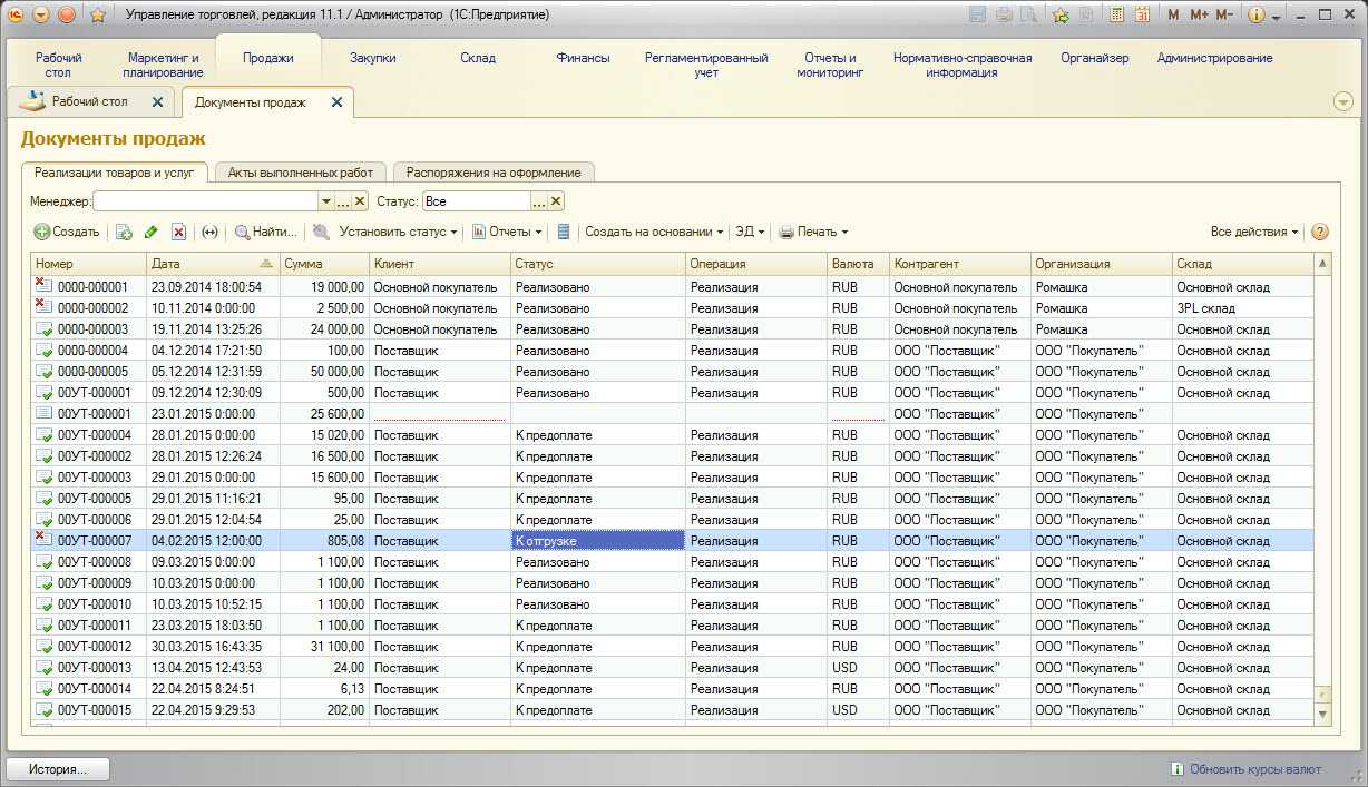 Для того чтобы посмотреть заказы, по которым можно оформлять документы реализации, необходимо выполнить следующие действия: выбрать меню «Продажи» — «Оптовые продажи» — «Накладные к оформлению». В открывшемся списке отображены все документы, по которым не было отгрузки или она не была завершена.