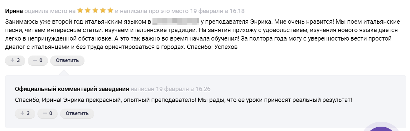 «Здравствуйте! Спасибо за такой теплый отзыв. Я обязательно передам ваши слова Энрике. Всем нашим иностранным преподавателям приятно, когда ученики сами видят прогресс и ходят на занятия с удовольствием. Спасибо, что отметили подход к обучению. Мы и правда не придерживаемся традиционной школьной системы, где есть только зубрежка и упражнения. Наши преподаватели стараются давать материал в непринужденной, игровой форме. Но при этом, конечно, приходится что-то учить. Наш опыт показывает, что это позволяет быстрее преодолеть языковой барьер. Зовите к нам друзей! Вместе веселее».