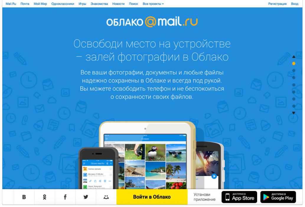 На втором месте стоит сервис от Mail.Ru. В бесплатном доступе он дает объем памяти (8 ГБ). Это больше, чем предыдущий вариант. Также выше и максимальный размер загружаемого файла (до 100 ГБ). Если вы захотите убрать баннеры, то необходимо будет оформить подписку. Предлагается несколько вариантов, поэтому каждый найдет удобное решение для конкретной цели. В бесплатной опции предусматривается агрегатор. Это программа, которая умеет преобразовывать облако в обычную папку и отображать ее на ПК, места при этом она занимать на устройстве не будет.