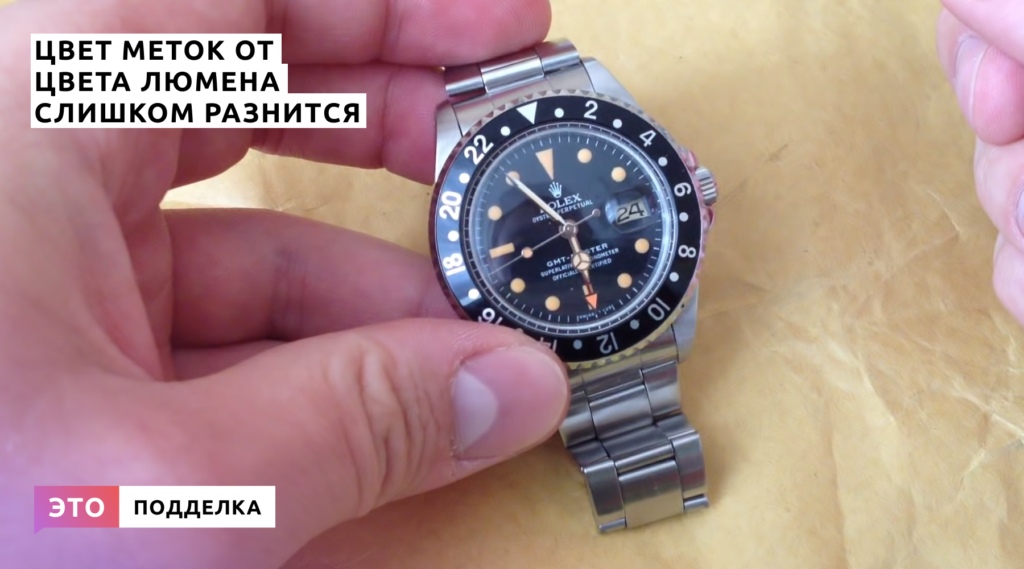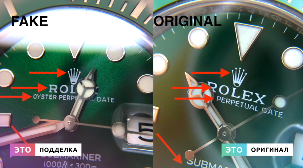 Что касается онлайн-магазинов, нужно осторожничать. Если присмотреться к фотографиям из интернета (магазинов поддельных часов), заметите на картинке идеальный товар. Часы — подделки, специально выставлены на фотографиях под определенным ракурсом — наискосок, чтобы покупатель не заподозрил неладное, это реплика и практически не определишь, чем она отличается от оригинала. Здесь и стрелки расположены ровно, и окошко даты вроде в порядке, цвет меток не отличишь, полировка идеальная, этим дубликат тоже отличается от копии. Обратную сторону «медали» стараются вообще скрыть, не показывая внутреннюю часть ремешка, «оригинальную» гравировку и заднюю крышку корпуса.