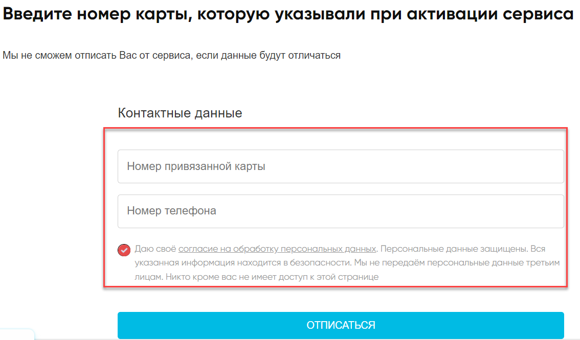 Укажите в форме номер банковской карты, с которой списали деньги и номер телефона. Нажмите «Отписаться» и подтвердите отписку по телефону, при необходимости.