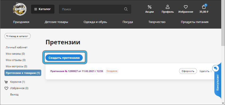 Если вы решили отказаться от приобретённого товара, сделать это можно не позднее семидневного срока с момента получения товара. Для этого необходимо в личном кабинете нажать на пункт «Претензии к товарам» и составить претензию, указав номер товара, который вы передумали использовать, его артикул, а также причину возврата.