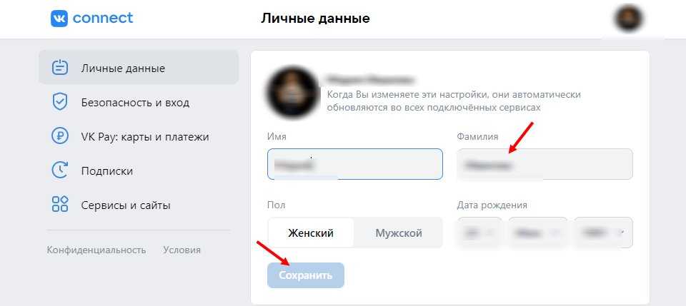 Изменение имени в настройках профиля