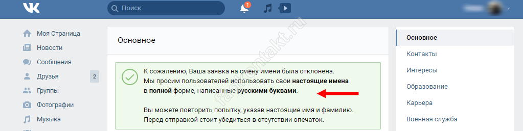 Обратите внимание, что изменения имени и отчества в профиле могут потребовать подтверждения со стороны администрации Вконтакте. В случае отказа вашего запроса, вы получите соответствующее уведомление