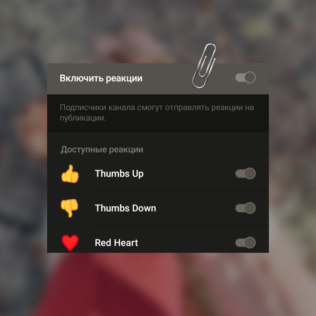 Обязательно включите реакции на вашем канале и в группе — это дополнительный способ взаимодействия с вашей целевой аудиторией. Откройте Настройки > Реакции и выберите ползунки нужных.