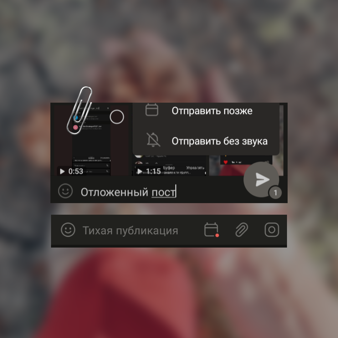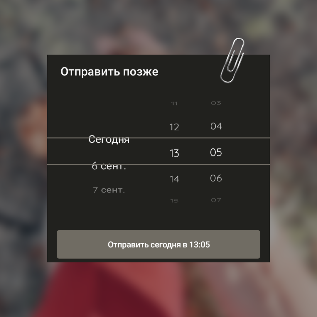 Для того чтобы сделать отложенный пост, нужно выбрать картинку, написать текст и использовать долгое нажатие на кнопку отправки. У вас появится два варианта > отправить пост сейчас или > запланировать публикацию.