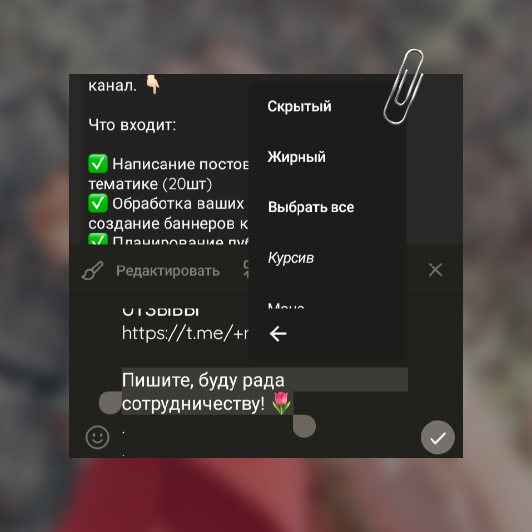 С этого момента можно с помощью @markdownbot создавать и публиковать посты в группе. Чтобы спрятать линк под текст в посте Телеграмм потребуется: