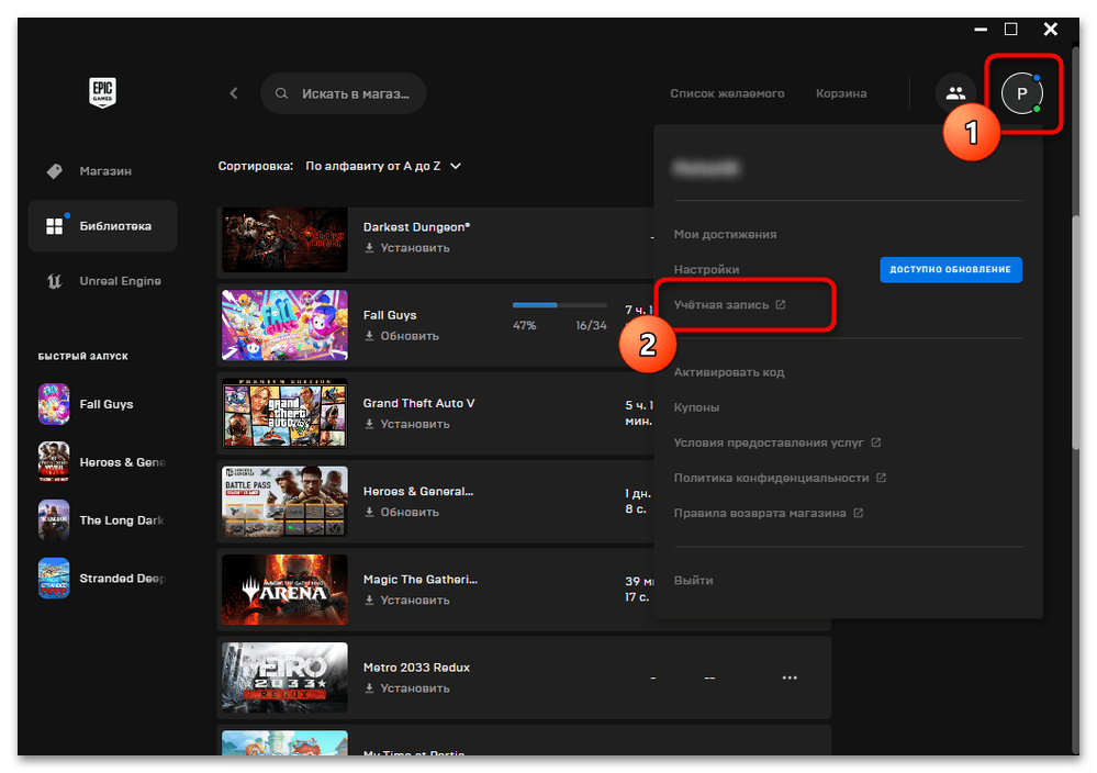 - Нажмите по значку со своей аватаркой в лаунчере Epic Games для вызова меню. Из него выберите пункт «Учетная запись».