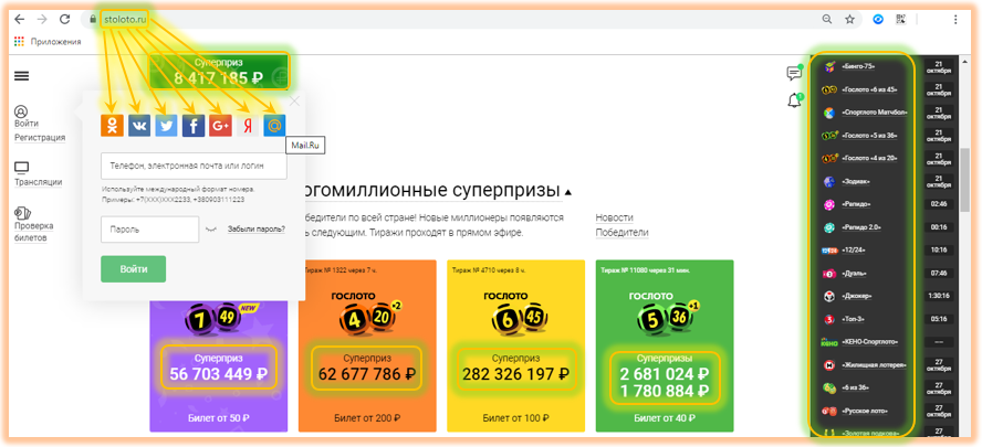Для особо азартных и очень уж нетерпеливых вход в Столото кабинет администрацией лотерейного мега-маркета предусмотрен также через социальные сети. Если у Вас есть профиль в соц. сети, и Вы в этот момент онлайн в соответствующей сети, то просто нажимаете на ее значок, и сразу оказываетесь в своем кабинете. Это можно сделать из Одноклассников, В контакте, Твиттера, Фейсбука, Гугла плюс, Яндекса или Мейл ру: