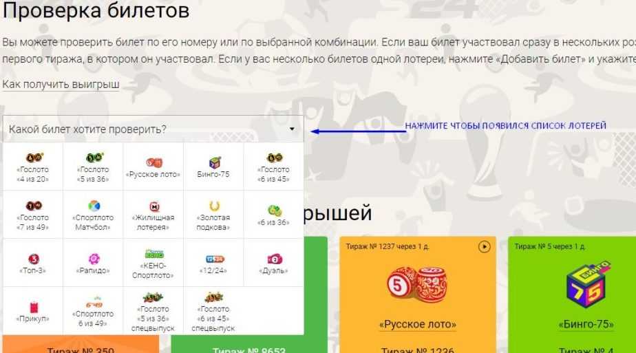Пролистайте страницу вниз и увидите список выбора лотерей. Нажмите и выберите нужную вам лотерею: Русское лото, Жилищная лотерея, 4 из 20, 5 из 36, 6 из 45 или другую, в которой вы участвовали.