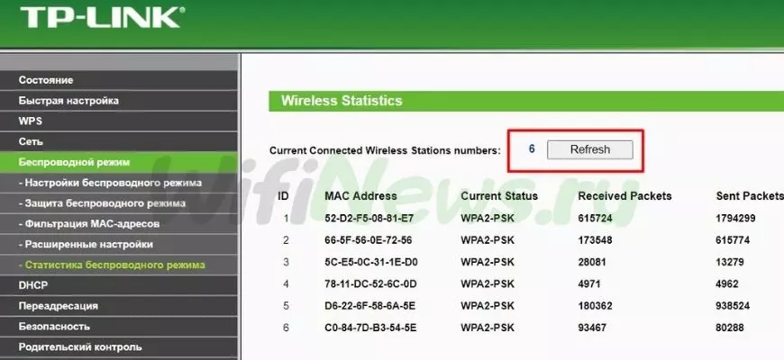 В разделе «Беспроводного режима» отдельно проверяют, чтобы не был подключён ни один из соседей. Достаточно посмотреть на статистику. В нашем случае 6 подключений.