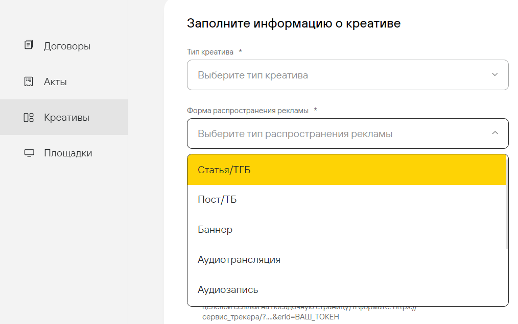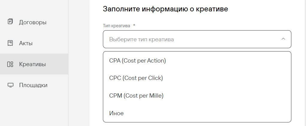 После этого нужно добавить информацию о креативе. Выбираем тип креатива — в нашем случае подходит вариант «Иное», так рекламодатель платит нам за разовое размещение статьи, а не за просмотры, клики или действия.