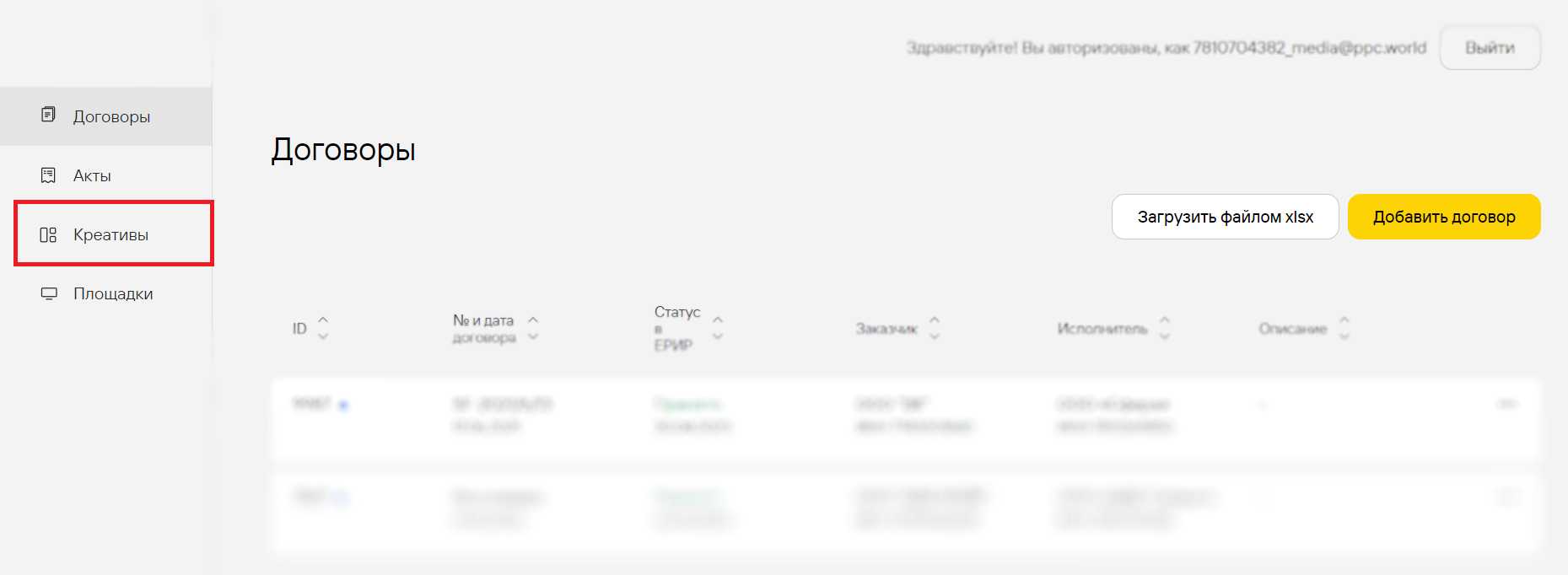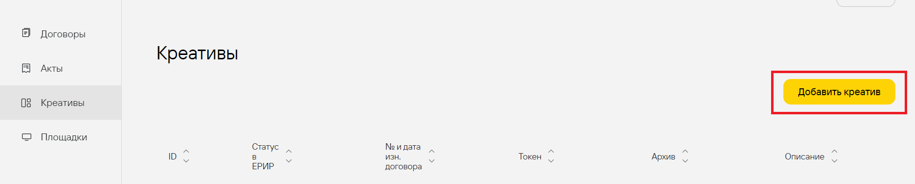 Теперь нам нужно получить заветный erid или токен. Для этого заходим в раздел «Креативы».
