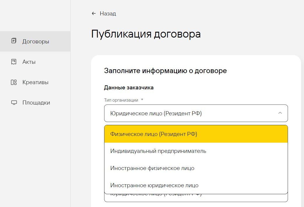 Второй шаг — вносим данные о заказчике. Выбираем тип организации: юридическое лицо, индивидуальный предприниматель, физическое лицо, иностранные ЮЛ и ФЛ. Самые часто используемые варианты — юридические лица и индивидуальные предприниматели.