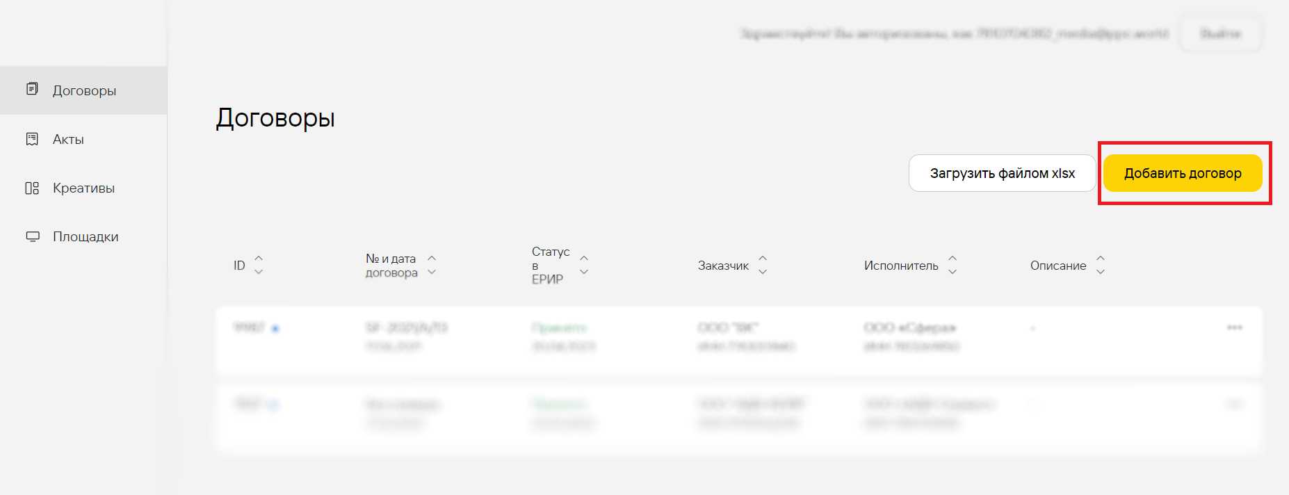 Первое, что нужно сделать после того, как договор с рекламодателем заключен, это внести его в ЕРИР. Для этого нужно зайти в ОРД — мы используем Первый ОРД от Билайна. В нем создаем договор, кликнув на соответствующую кнопку: