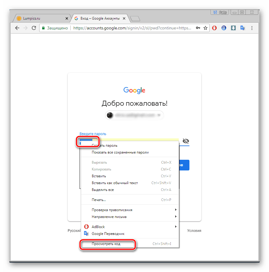 - После выхода откроется вкладка с формой входа в аккаунт. Выделите строку зажав левую кнопку мыши и проведя по ней, затем нажмите правую кнопку мыши и выберите пункт «Просмотреть код»( иногда этот пункт называется «Исследовать элемент»).