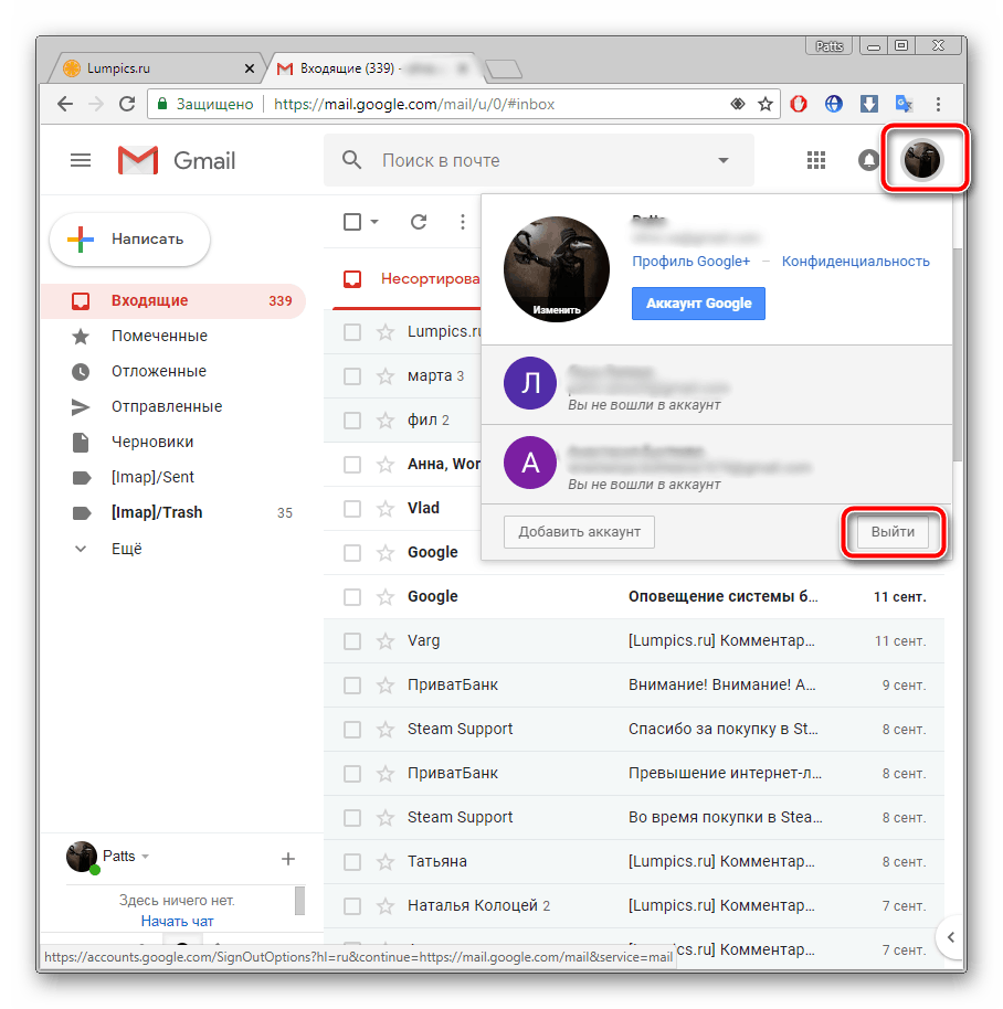 - В любом удобном браузере перейдите к своей учетной записи электронной почты и выйдите из нее.