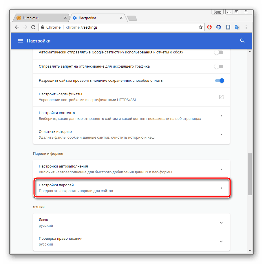 - Откройте в категории «Пароли и формы» пункт «Настройки паролей».