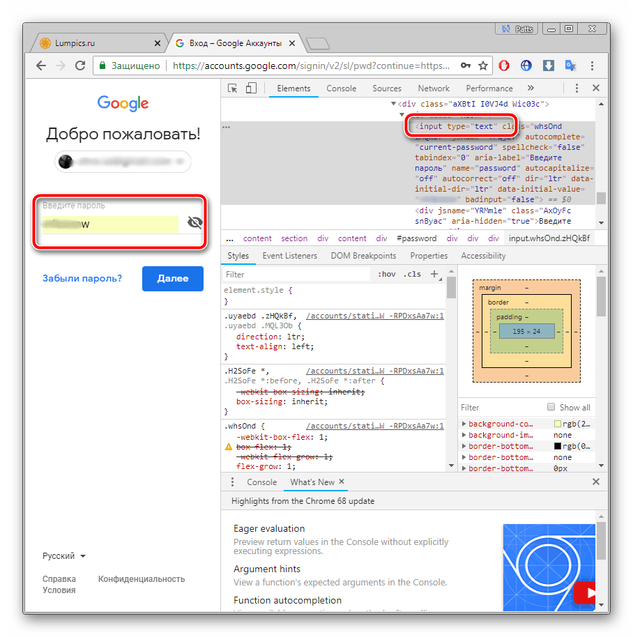 - Затем откроется консоль, содержащая код страницы, где синим цветом будет подсвечен кусок необходимого для просмотра элемента. Напротив слова name (имени кода элемента) будет написано password, а в значении будет прописан пароль в виде символов, а не точек, при условии, что включена функция автозаполнения.