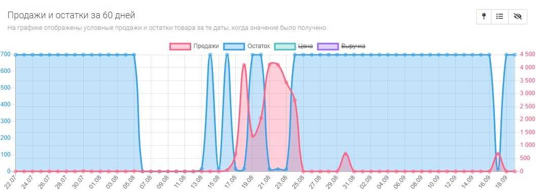 Справа от основной информации собраны данные за каждый день торговли товаром в выбранном периоде. Информация представлена в виде графика и таблицы. Здесь можно оценить такие показатели как: Продажи, Остаток, Цена, Выручка. Для отображения необходимых параметров, нужно нажать на соответствующие показатели над графиком.