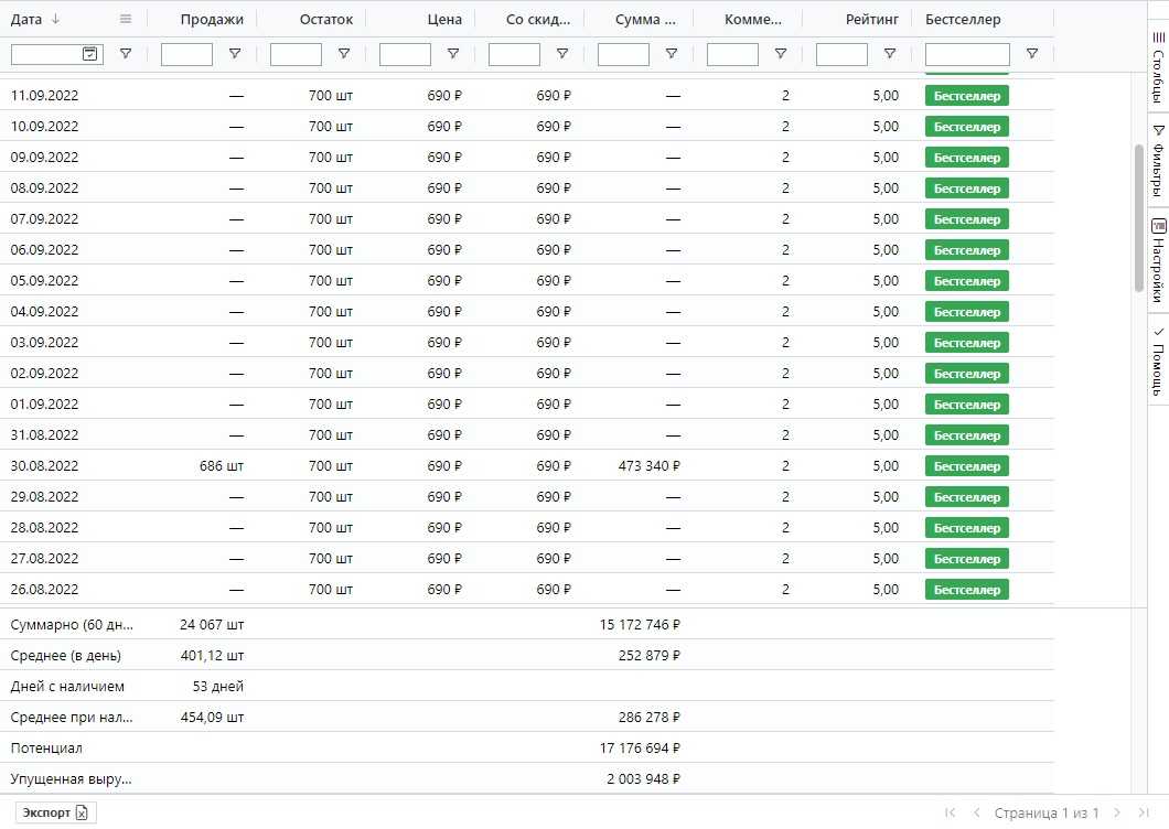 В сводной таблице данная информация представлена более подробно, она также включает сведения о Скидке, Сумме продаж, Комментариях, Рейтинге товара и о том, в какие даты он был Бестселлером. Также внизу таблицы содержатся данные о суммарных продажах за 60 дней, среднем количестве продаж в день, количестве дней с товаром в наличии, среднем количестве продаж при наличии товара и потенциале продаж.
