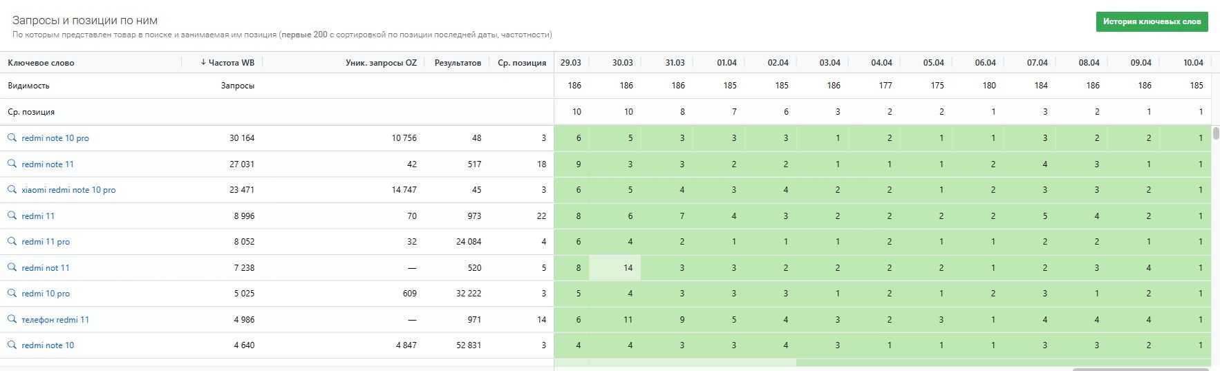 Таблица Запросы и позиции по ним содержит информацию о том, по каким запросам клиенты ищут рассматриваемый товар и на какой позиции в поисковой выдаче он находится. В отчет попадает информация только первой страницы результатов поиска на Ozon (до 100 позиций).