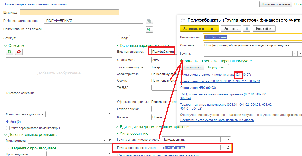 карточке номенклатуры. Если для продукции традиционный счет учета – 43, то для полуфабрикатов это 21-й счет.