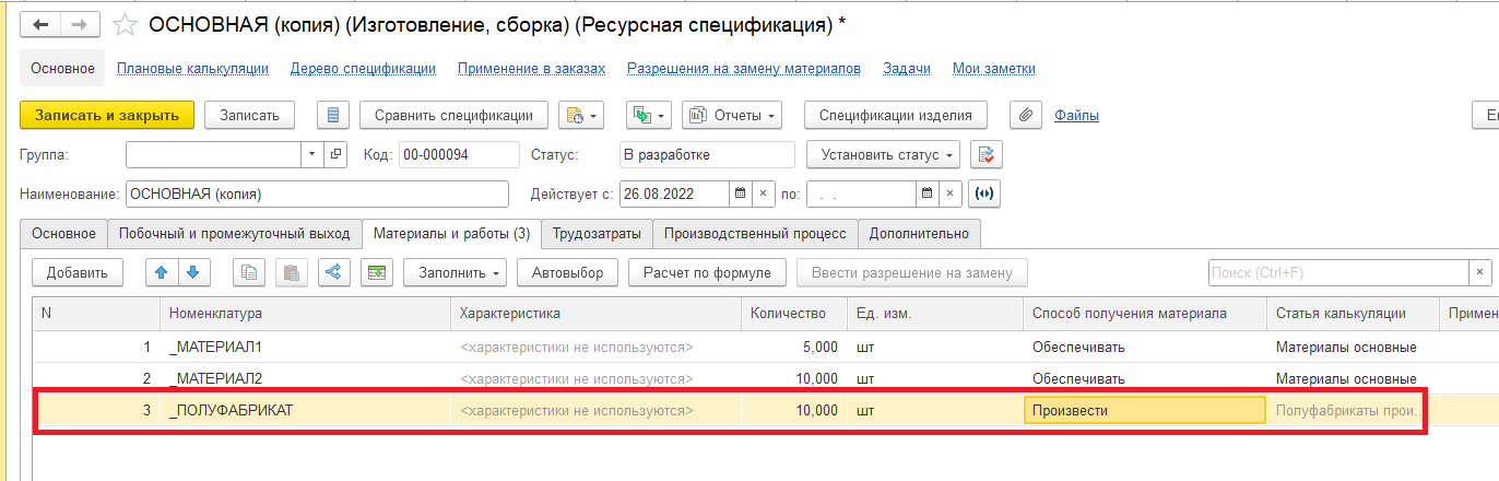 Используемые полуфабрикаты можно «вычислить» по их присутствию на закладке «Материалы» в ресурсной