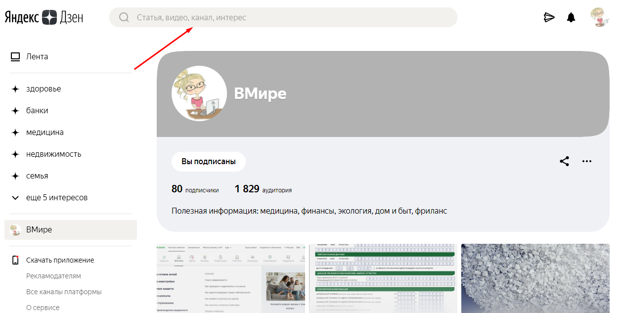В Дзен найти интересующий канал можно также через встроенный поиск. Для этого нужно ввести слова из его названия в поисковую строку и посмотреть результаты.