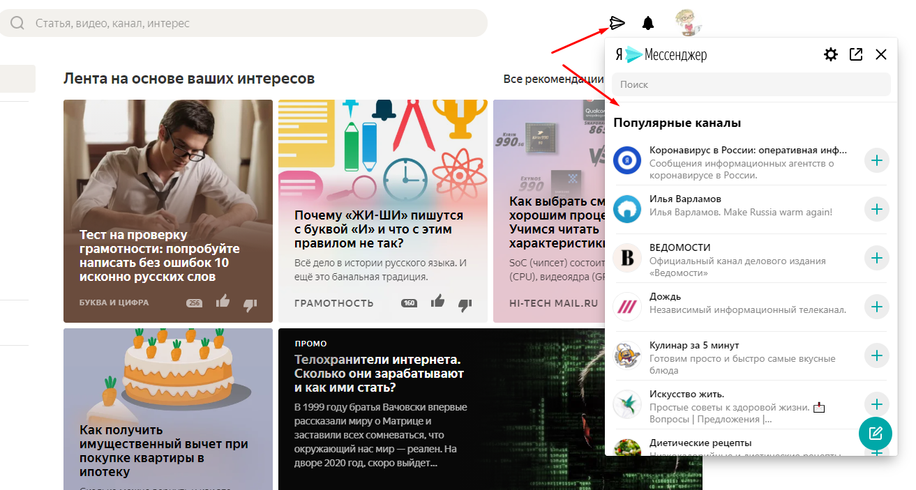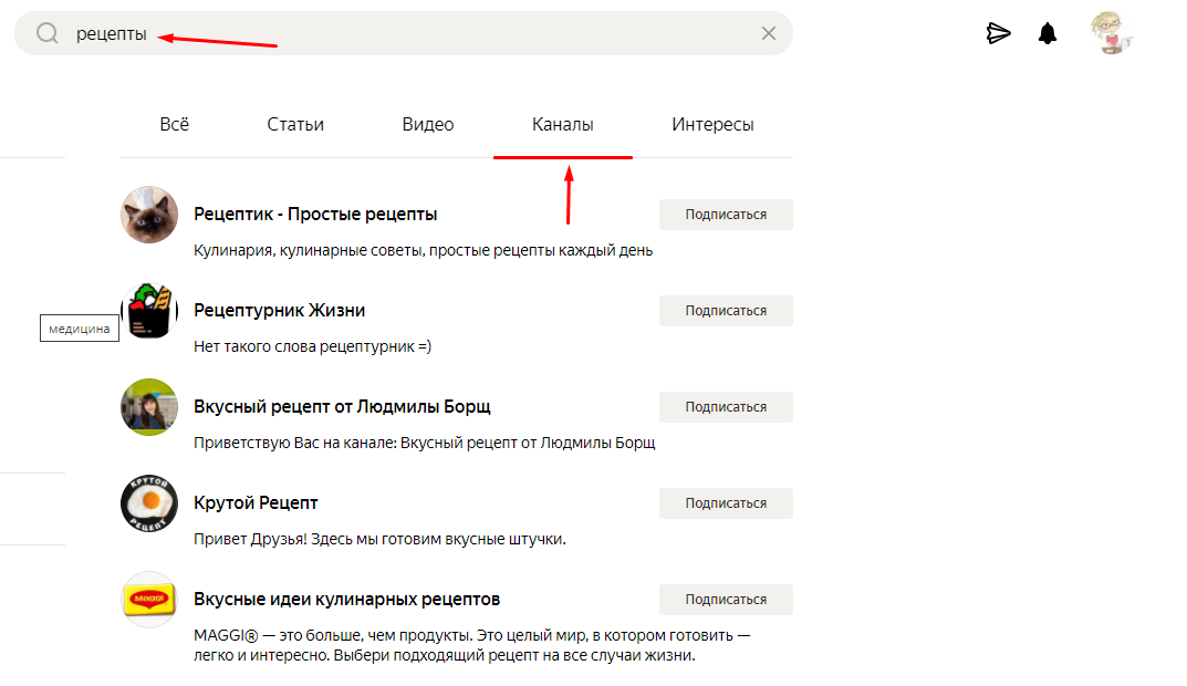 Поиск каналов по интересам похож на стандартный поиск информации. Единственное отличие – после того, как система выдаст результаты поиска надо переключиться на вкладку «интересы». Здесь будут представлены каналы, в названии или описании которых нет ключевых слов, однако они подходят по интересам.