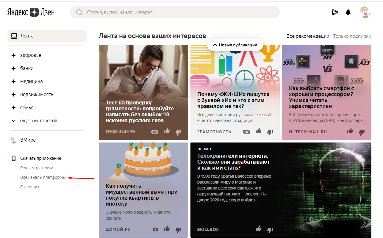 Чтобы найти канал в каталоге Дзена, достаточно перейти на вкладку «Все каналы платформы». Здесь они ранжируются по темам. Нужно выбрать тему и нажать на нее. Дзен покажет 50 самых успешных каналов. При этом каждый из них имеет краткое описание и кнопку подписки. На него можно сразу подписаться, либо сначала перейти в него и посмотреть публикации. Этот способ хорош, чтобы найти себе интересное чтиво по заданной тематике. Однако он не подходит, чтобы найти конкретный канал. Кроме того, этот способ ограничен лишь 50-ю топовыми каналами по каждой тематике.