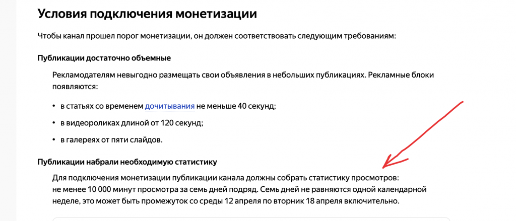 Минимальное время прочтения (просмотра) вашей публикации должно составлять 40 секунд. По убеждению Яндекса рекламодатели хотят видеть свою рекламу именно в объемных публикациях. Иначе эффективность рекламы снижается. Поэтому для монетизации допускаются только достаточно длинные тексты и видеоролики продолжительностью от 2 минут.