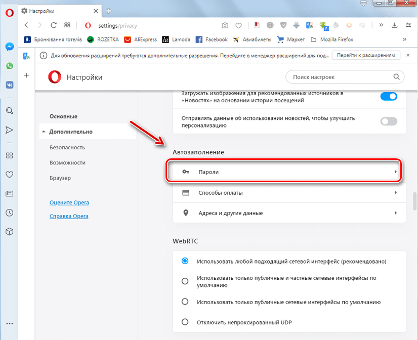 Например, в Опере нужно открыть меню в верхнем левом углу, найти «Настройки», в левом меню «Дополнительно», затем «Безопасность», выбрать раздел «Автозаполнение» и пункт «пароли».