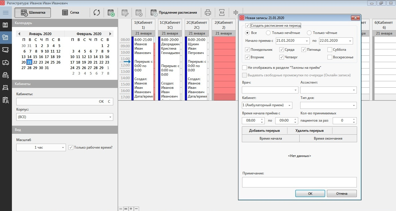 Затем указываем начало и окончание приема,Также можно добавить или удалить перерыв и по необходимости добавить примечание. Далее нажимаем на кнопку «Ок» – новое расписание готово.