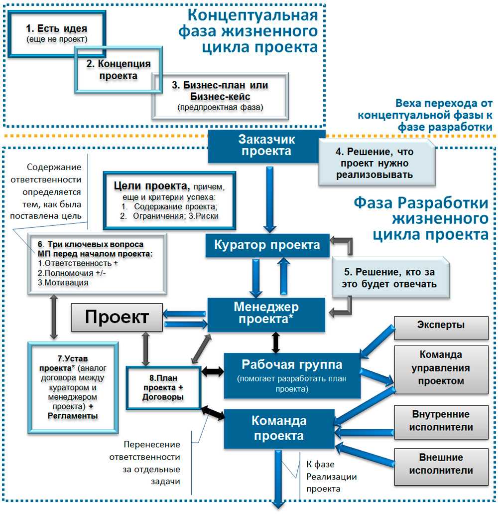 Концепция проекта, одобренная проектным комитетом или первым лицом компании, как раз знаменует начало запуска его в работу. Однако не возникает вывода, что проект окончательно отобран в портфель и должен быть обязательно реализован в тактической перспективе. Возвращаясь к фазам ЖЦП, отметим, что обычно выделяются четыре его этапа: концепция, разработка, реализация и завершение. И если переводить проектную задачу в плоскость процессуального подхода, то в общем смысле можно заключить, что концептуальная фаза и этап разработки по совокупности действий соответствуют процессам инициации и планирования. Однако процессы планирования не заканчиваются с наступлением фазы реализации и продолжаются плоть до завершения.