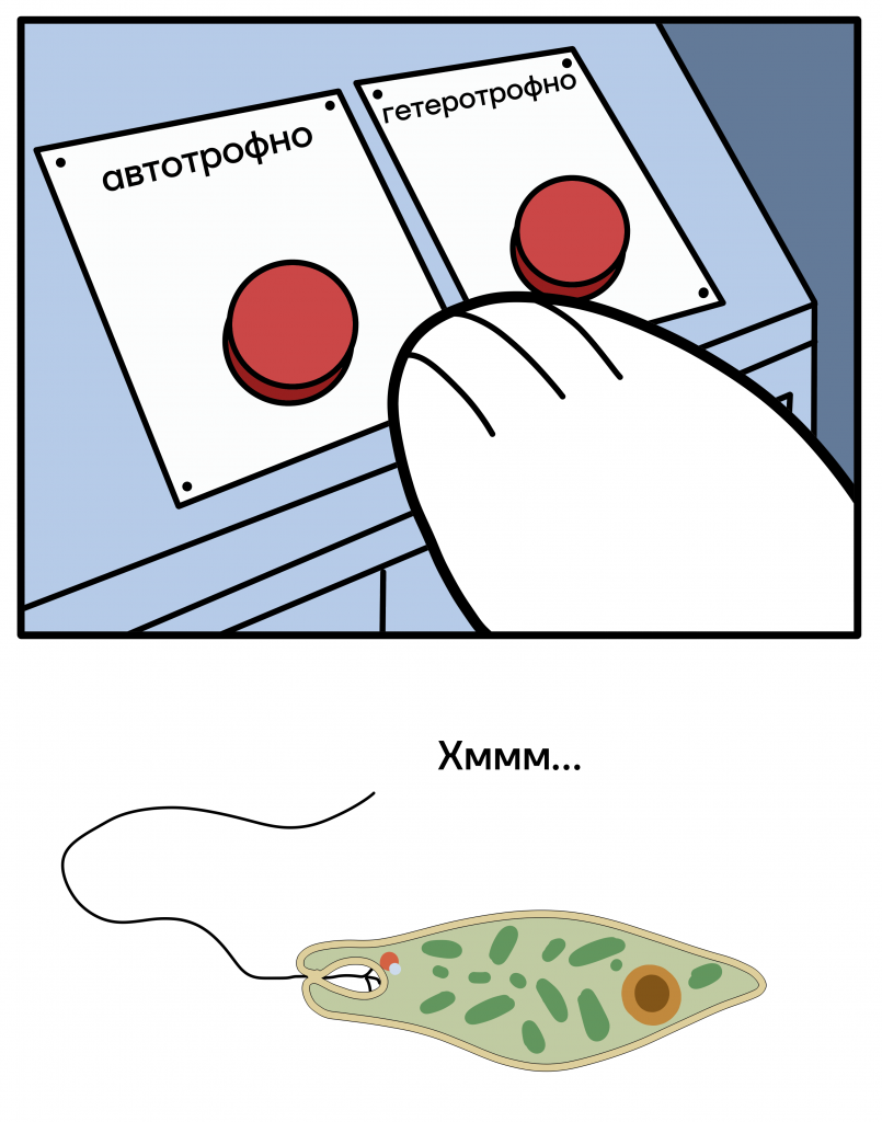 Это очень удобный механизм выживания, как у калькулятора с солнечными батареями: если нет обычной батарейки, можно работать от энергии света. Такой тип питания имеет Эвглена зелёная. Как мы упомянули выше, она предпочитает питаться автотрофно, но может также и гетеротрофно.