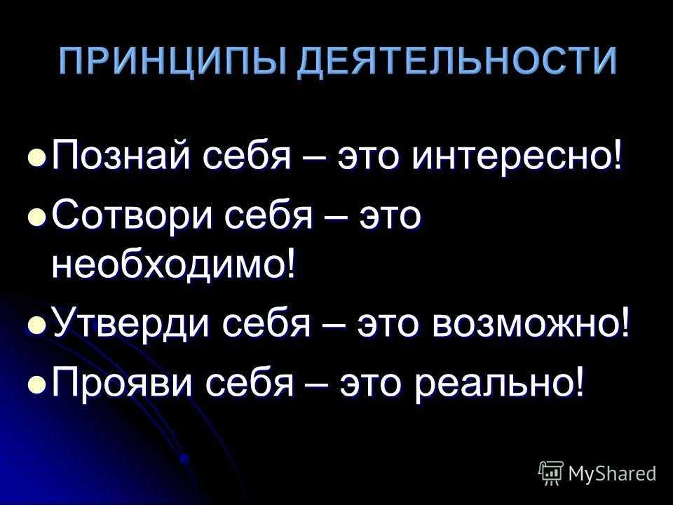 Познай себя – это интересно! Познай себя – это интересно! Сотвори себя – это необходимо! Сотвори себя – это необходимо! Утверди себя – это возможно! Утверди себя – это возможно! Прояви себя – это реально! Прояви себя – это реально!