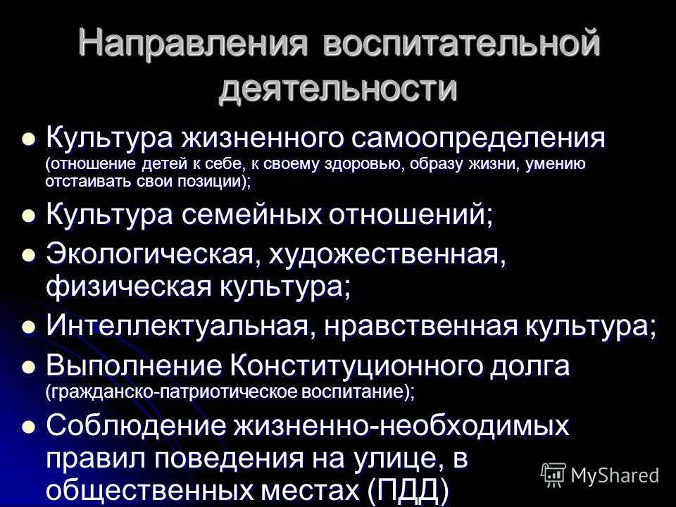 Направления воспитательной деятельности Культура жизненного самоопределения (отношение детей к себе, к своему здоровью, образу жизни, умению отстаивать свои позиции); Культура жизненного самоопределения (отношение детей к себе, к своему здоровью, образу жизни, умению отстаивать свои позиции); Культура семейных отношений; Культура семейных отношений; Экологическая, художественная, физическая культура; Экологическая, художественная, физическая культура; Интеллектуальная, нравственная культура; Интеллектуальная, нравственная культура; Выполнение Конституционного долга (гражданско-патриотическое воспитание); Выполнение Конституционного долга (гражданско-патриотическое воспитание); Соблюдение жизненно-необходимых правил поведения на улице, в общественных местах (ПДД) Соблюдение жизненно-необходимых правил поведения на улице, в общественных местах (ПДД)