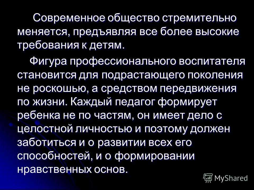 Современное общество стремительно меняется, предъявляя все более высокие требования к детям. Современное общество стремительно меняется, предъявляя все более высокие требования к детям. Фигура профессионального воспитателя становится для подрастающего поколения не роскошью, а средством передвижения по жизни. Каждый педагог формирует ребенка не по частям, он имеет дело с целостной личностью и поэтому должен заботиться и о развитии всех его способностей, и о формировании нравственных основ. Фигура профессионального воспитателя становится для подрастающего поколения не роскошью, а средством передвижения по жизни. Каждый педагог формирует ребенка не по частям, он имеет дело с целостной личностью и поэтому должен заботиться и о развитии всех его способностей, и о формировании нравственных основ.