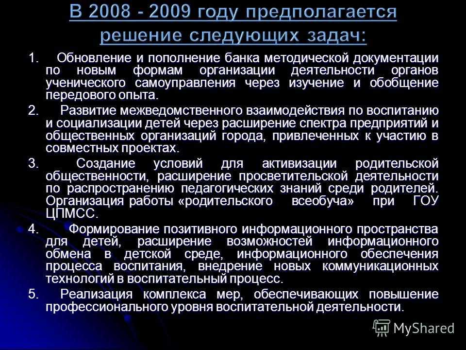 1. Обновление и пополнение банка методической документации по новым формам организации деятельности органов ученического самоуправления через изучение и обобщение передового опыта. 2. Развитие межведомственного взаимодействия по воспитанию и социализации детей через расширение спектра предприятий и общественных организаций города, привлеченных к участию в совместных проектах. 3. Создание условий для активизации родительской общественности, расширение просветительской деятельности по распространению педагогических знаний среди родителей. Организация работы «родительского всеобуча» при ГОУ ЦПМСС. 4. Формирование позитивного информационного пространства для детей, расширение возможностей информационного обмена в детской среде, информационного обеспечения процесса воспитания, внедрение новых коммуникационных технологий в воспитательный процесс. 5. Реализация комплекса мер, обеспечивающих повышение профессионального уровня воспитательной деятельности.