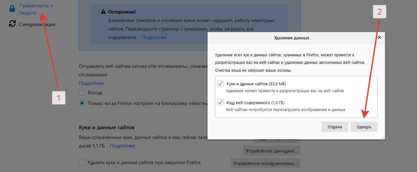 - Третий и обязательный шаг – чистка куки и кеша. Для браузера Мозиллы необходимо зайти в настройки, затем открыть пункт «Приватность и защита» и напротив надписи «Куки и данные сайтов»/ Тут нажимаем «Удалить данные». Как видно на скрине ниже кешированное веб-содержимое занимает без малого 1гб памяти на жестком диске.
