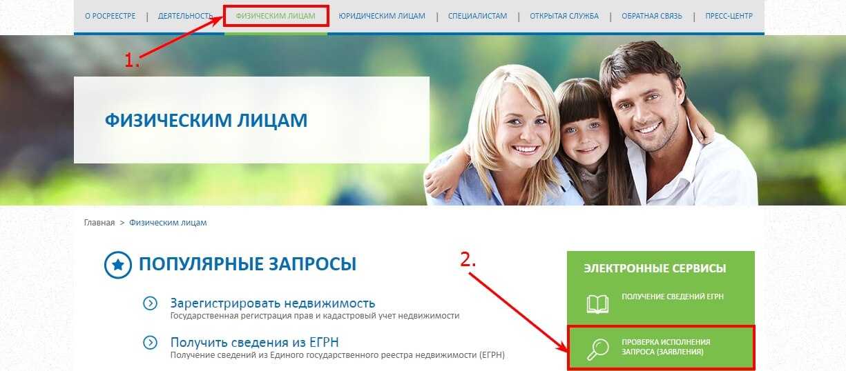 Чтобы узнать статус заявки МФЦ через Росреестр, нужно выбрать вкладку «Физические лица». Далее выбираем «Проверить выполнение запроса», где написан номер заявки. Кроме того, сервис предоставляет данные об этапах рассмотрения апелляции.
