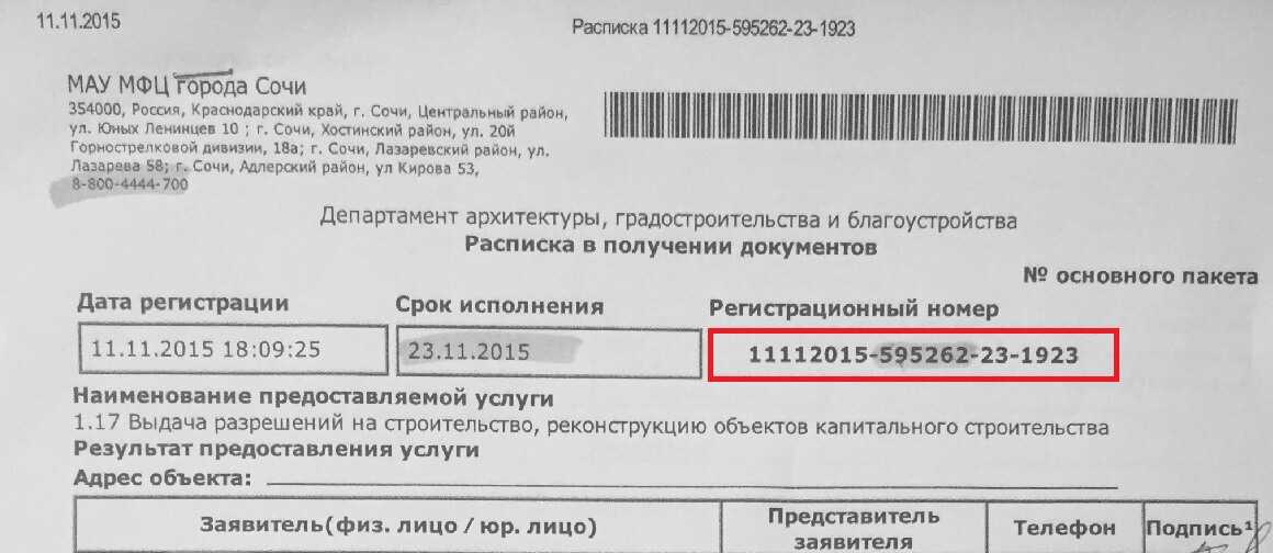 - регистрационный номер расписки (он отмечен на фото) – именно по этим данным и можно проверить, на каком этапе находится заявка в МФЦ, а также степень готовности документов.