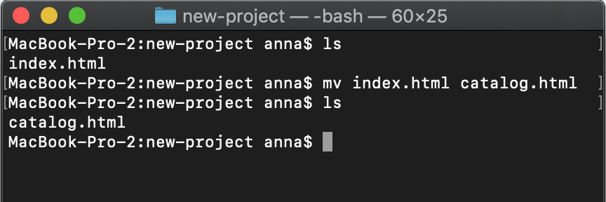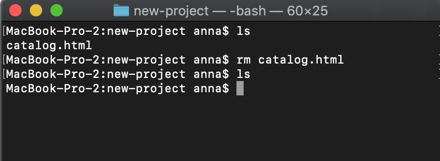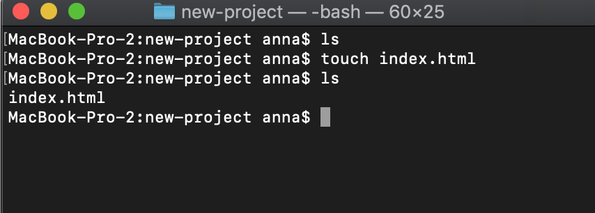 touch название файла — создаёт файл, а также указывает расширение, например touch index.html. На скриншоте при первой команде ls ничего не вывелось в терминал, потому что папка была пустой.