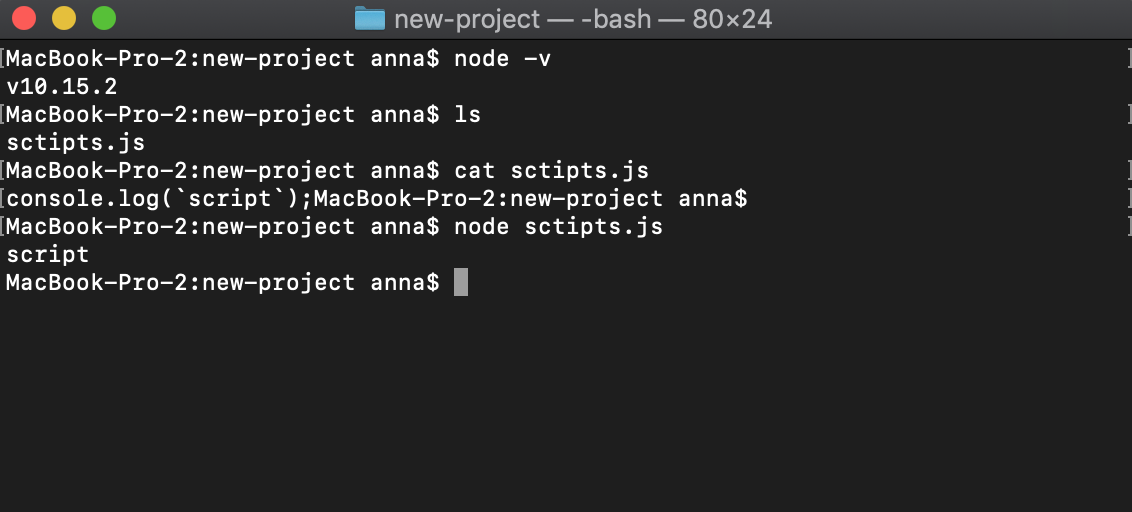 node файл — запускает js-файл. Чтобы это сделать, нужно установить на свой компьютер node. В примере использован файлик со строкой, поэтому в консоли появляется вывод «script»: