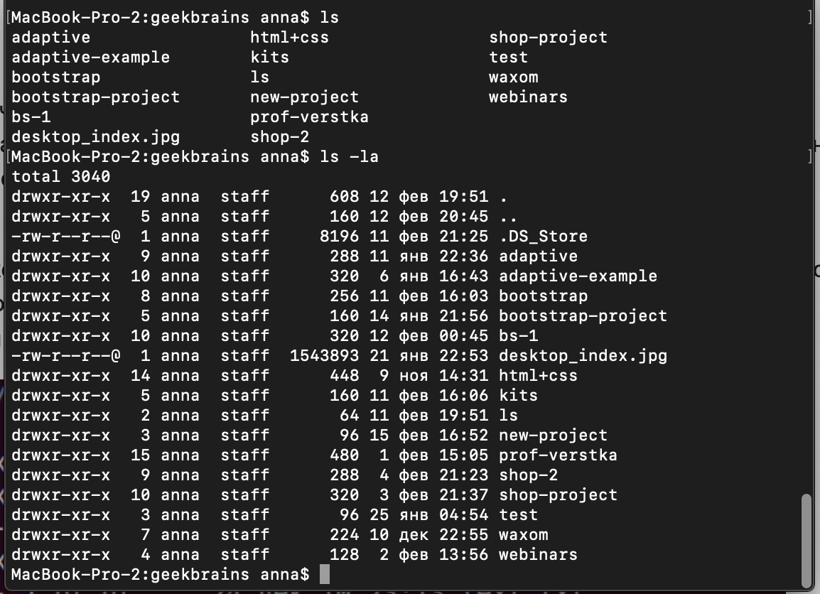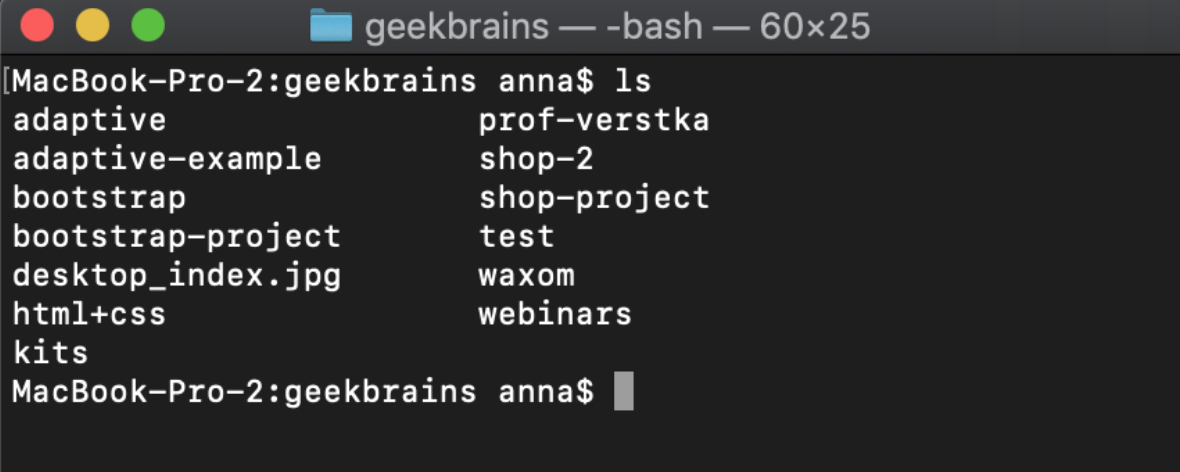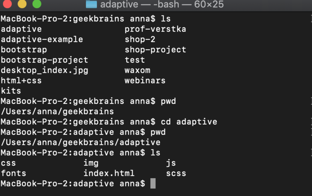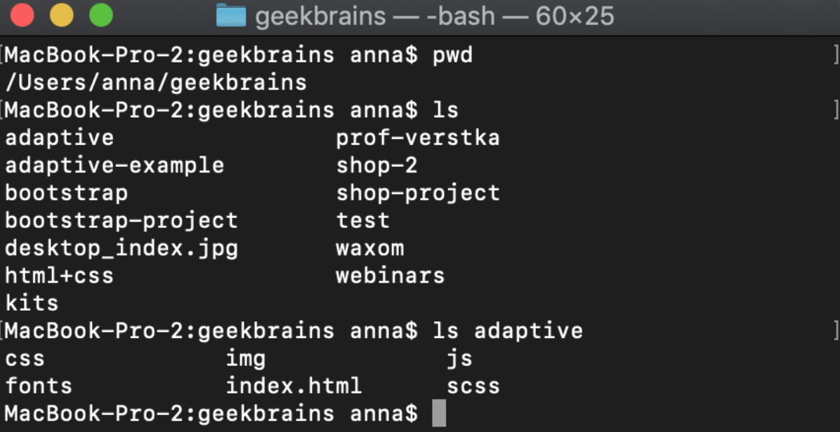 ls путь до папки поможет посмотреть содержимое в папке, в которую вы прокладываете навигацию относительно вашего текущего места. Например, вы находитесь в папке ~geekbrains и хотите просмотреть файлы в ~geekbrains/adaptive — тогда вам нужно написать ls adaptive.